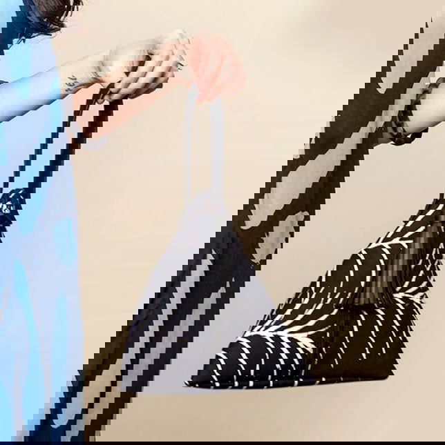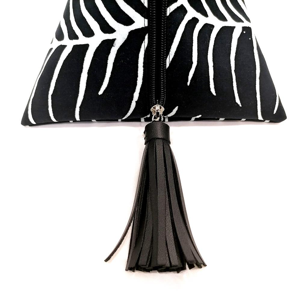 This pyramid-shaped bag showcases the Black Fern pattern is a celebration of the stunning environment around Malaysia and crafted using traditional batik techniques. Made from 100% cotton, it features a zipper with a PU leather tassel and a wrist strap for easy carrying. Perfect for cosmetics or small essentials, it blends cultural artistry with practical style.