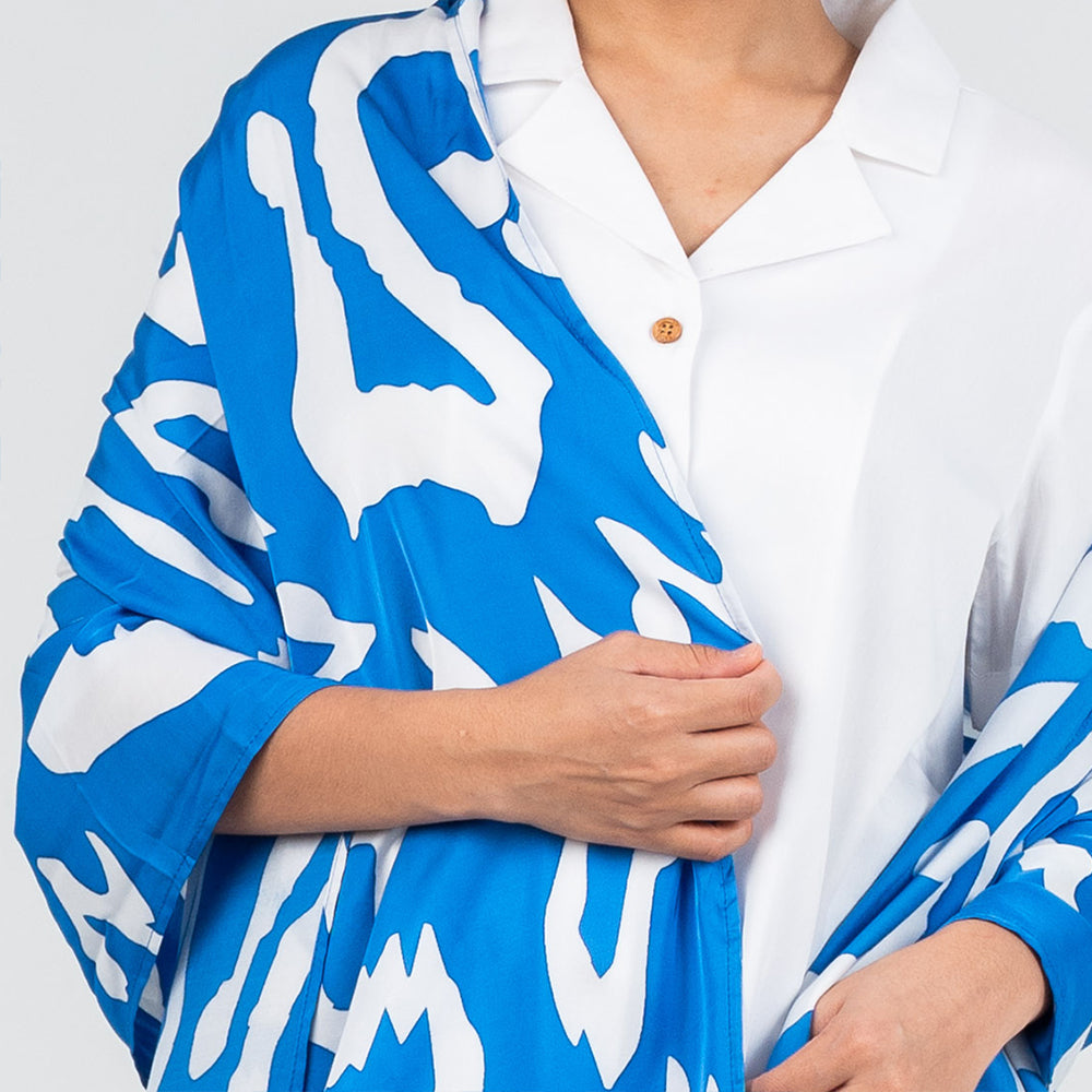 The Rimba or "Jungle," print evokes adventure and untamed strength, perfect for those seeking a powerful and daring look. It features a luxurious blend of rich blue and soft white hues, offering a bold yet refined contrast.