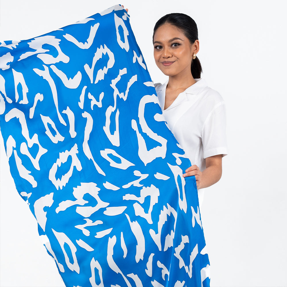 Showcasing the Blue Rimba print in a blend of tan and beige, offering a luxurious look to the scarf which blends natural beauty with Malaysia’s batik heritage. Crafted from soft, breathable silk-cotton, it’s lightweight and versatile—ideal as a neck scarf, shawl, or head wrap. Handmade using eco-friendly dyes, with fine hemming and an embroidered logo. Presented in a sleek gift box.