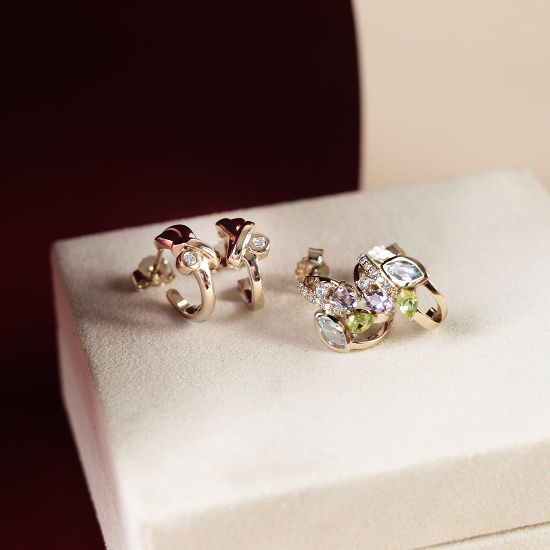 Perfect for all your floral dresses! Colour yet elegant , these small hoop earrings feature amethyst, peridot, blue topaz and cubic zirconia. Crafted in 925 sterling silver with gold plating or rhodium plating, hence no worries of tarnish. Great for the office with a pant suit and its matching ring.