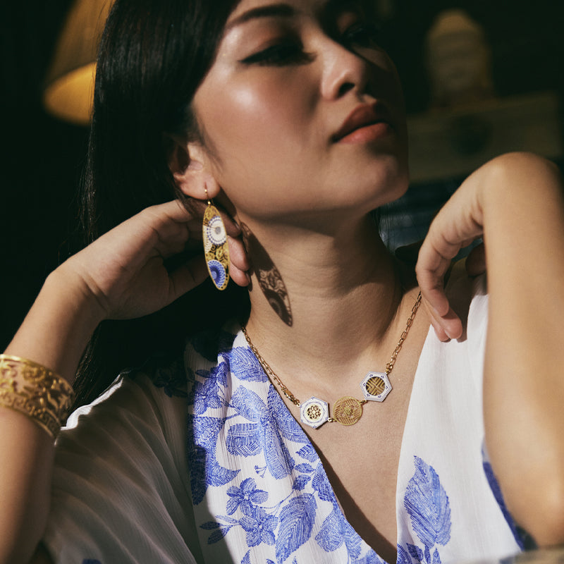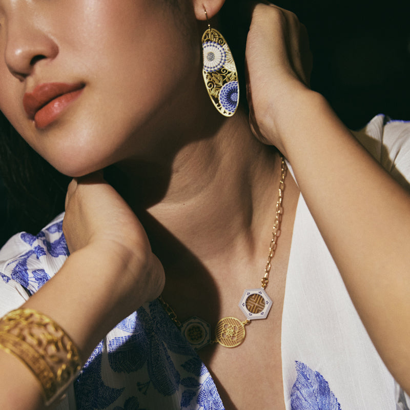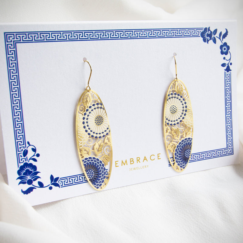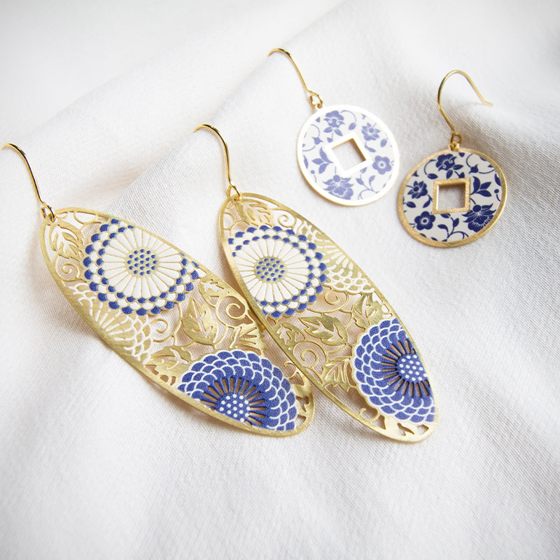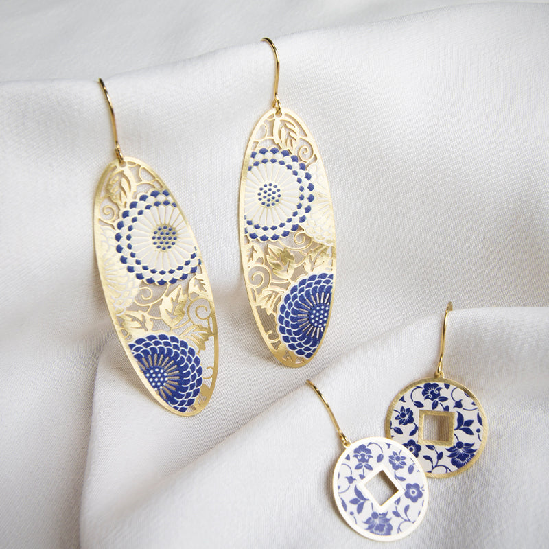 A definite conversation starter! These oval hook earrings feature intricate chrysanthemum flower design with touches of blue and white. Crafted in brass with gold plating and features 925 sterling silver hook findings! Let this contemporary earrings be the star of the show and pair with a white maxi dress.