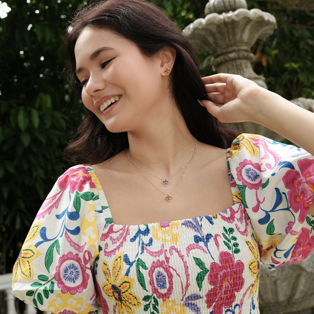 Classic, everyday piece that will make your outfit stand out. This pendant necklace features an etched 4-petal flower design with garnet and a black spinel in the center. Crafted in 925 sterling silver with gold plating or rhodium plating, hence no worries of tarnish. With its vibrant gems and feminine design, this piece will make subtle statement. Style alongside its matching earrings and a little black dress for a date night look.