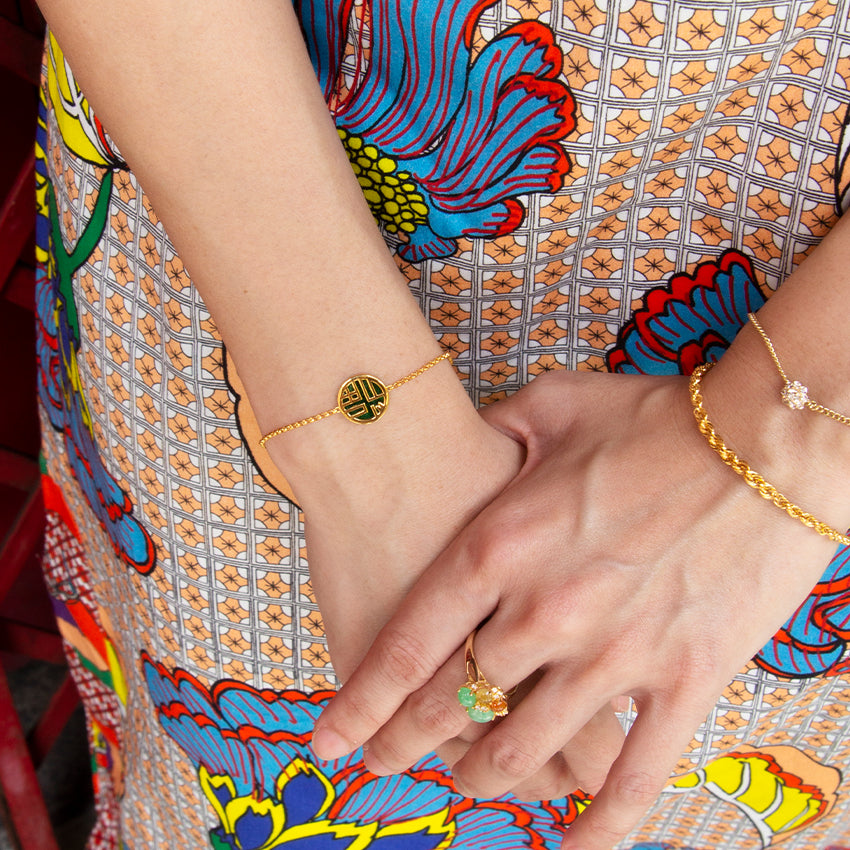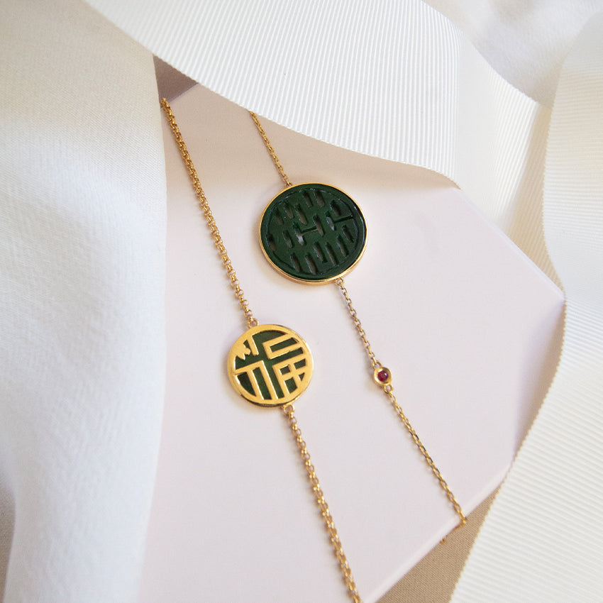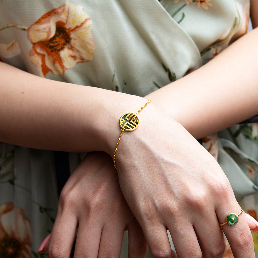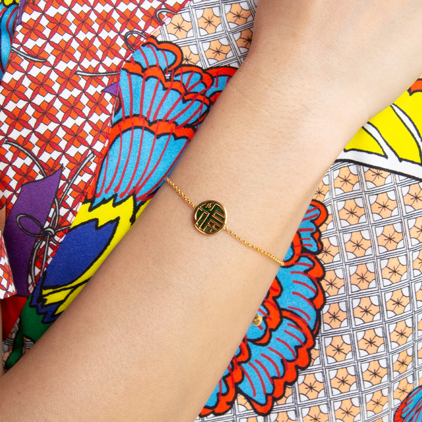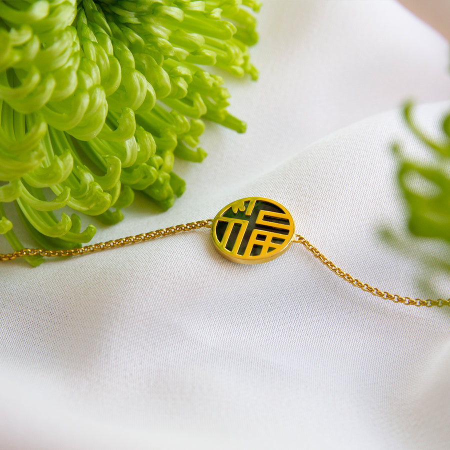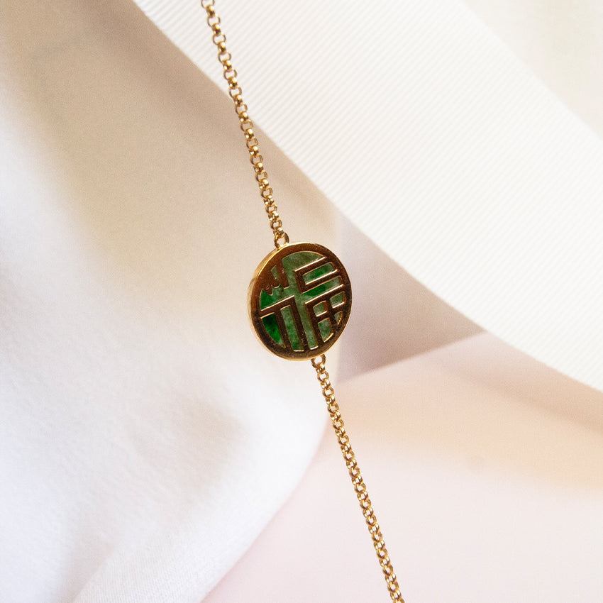 Good fortune coming your way! This bracelet feature a Grade A Jade disc with the chinese character " 福" (which means good luck) set on a thick gold chain. The pendant is reversible, hence can be worn 2 ways. Crafted in 18K solid gold, this bracelet is made for everyday wear. Wear this modern jade piece on its own or stacked with a gold bangle.