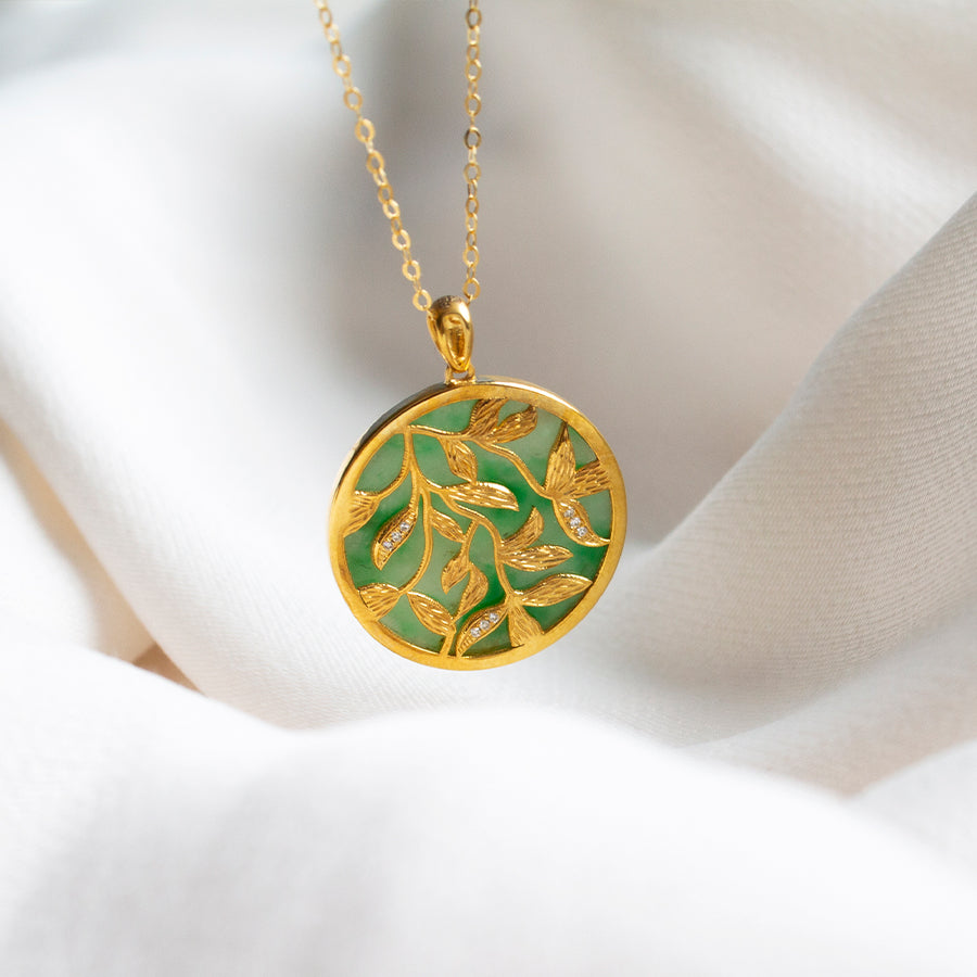 This necklace is not leaving your neck! This necklace feature a Grade A Jade disc pendant with a leaves design and pave diamonds. Crafted in 18K solid gold, this pendant is made to last. Comes with 925 sterling silver chain. With its reversible pendant, this necklace can be styled with the leaves facing up or the plain jade side for a more minimal look. We love this beauty with a long floral dress and simple gold earrings.