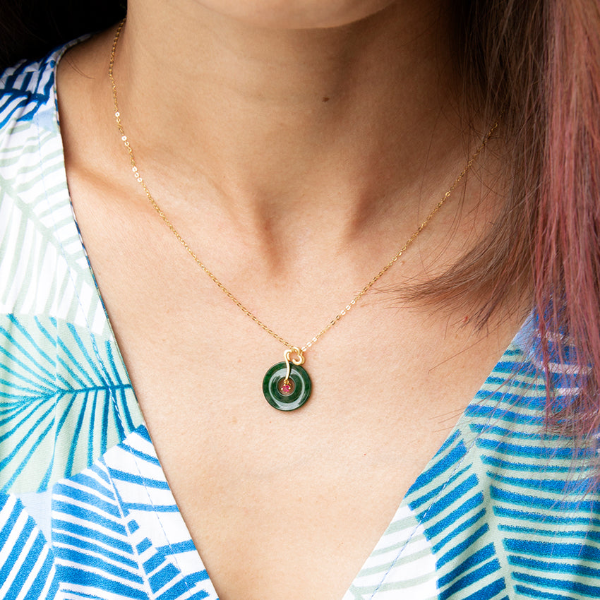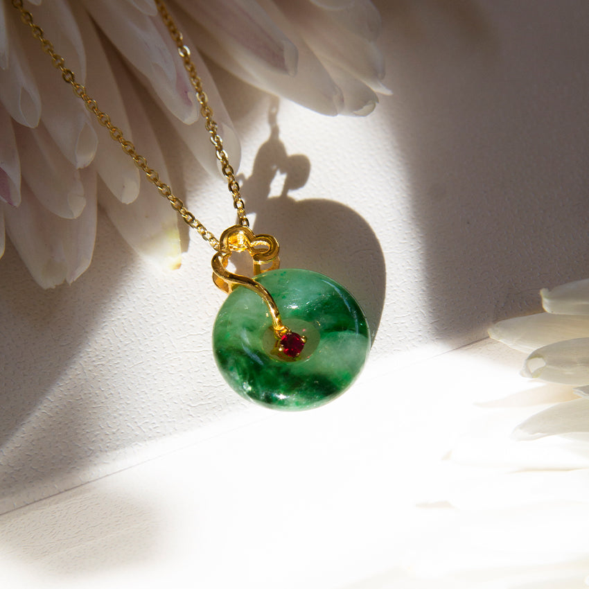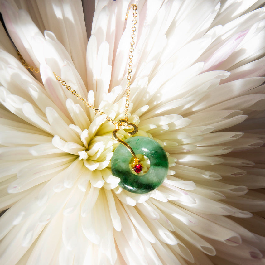 Chinois chic! This necklace feature a Grade A Jade donut with a cloud motif and a ruby hanging in the centre, set on a fine gold chain. Crafted in 18K solid gold, this necklace is made to last. Style it with a floral dress and simple gold studs for a dinner date.