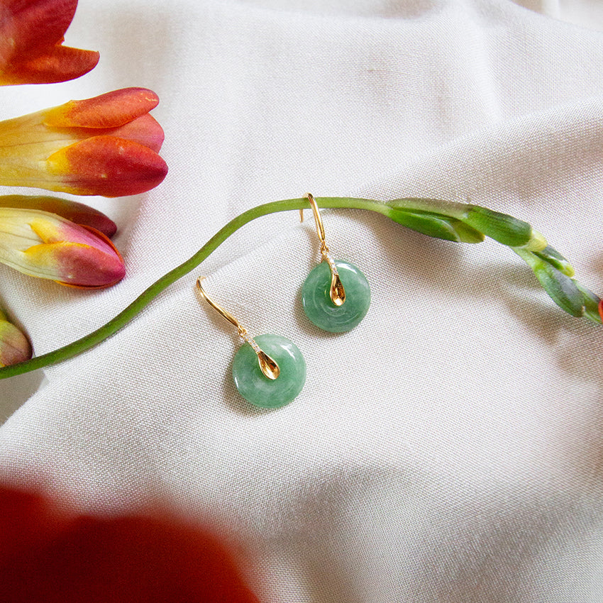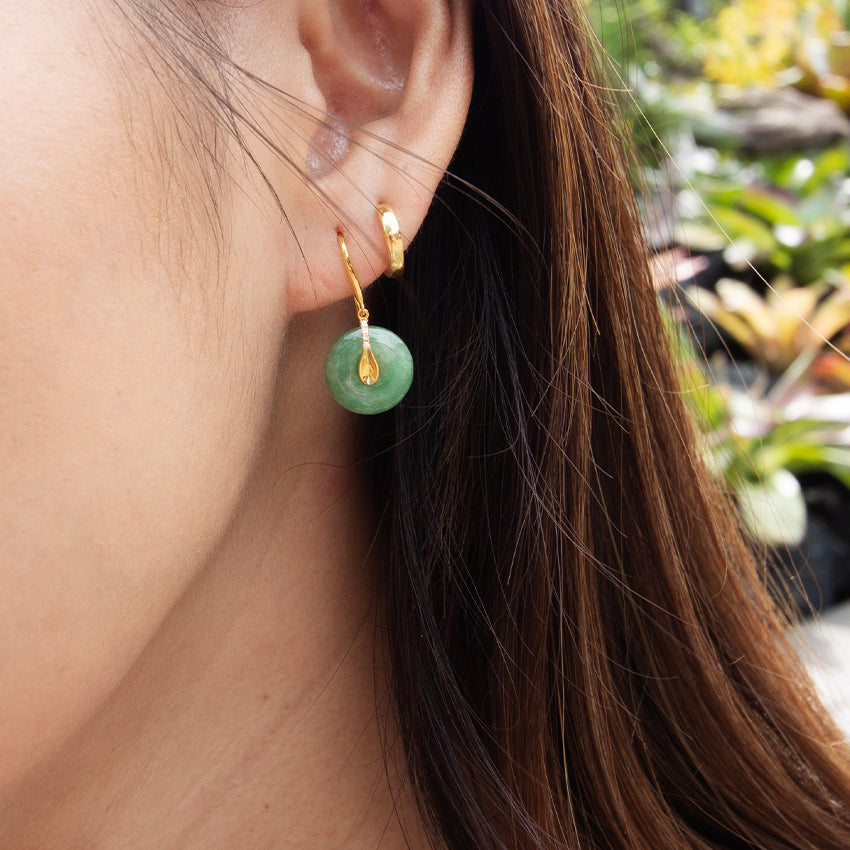 Let your lobe glow with this brilliant piece! These hook earrings feature Grade A Jade donuts with four 0.024 Carat diamonds on each side. Crafted in 18K solid gold, these earrings are made to last. These luminous hook earrings are perfect for adding a small pop of colour to your outfits.