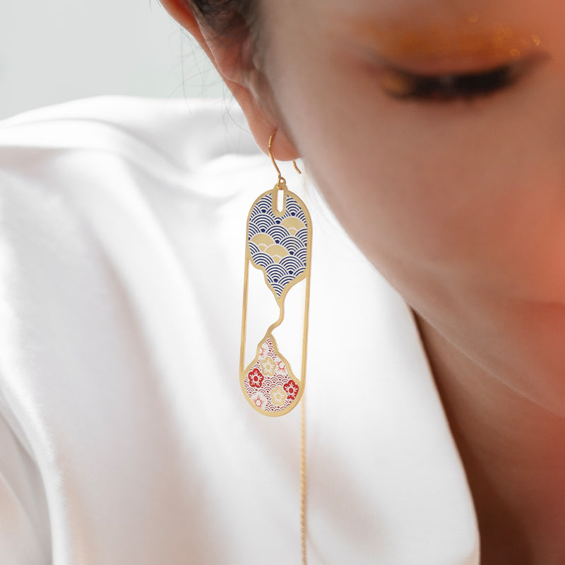 Bold and beautiful! Inspired by kintsugi, these oval shaped earrings feature fragments of 2 different prints melded together. Crafted in brass with gold plating and anti-tarnish. Style these statement earrings with a red printed blouse for a festive look.