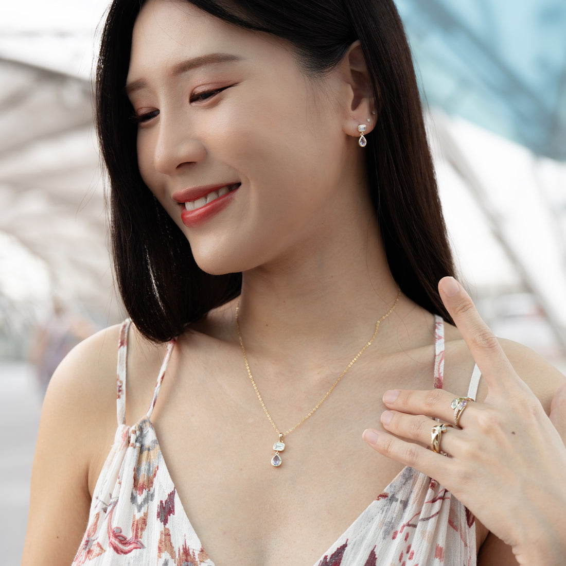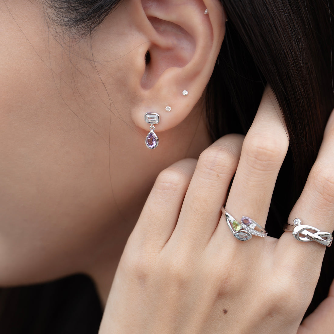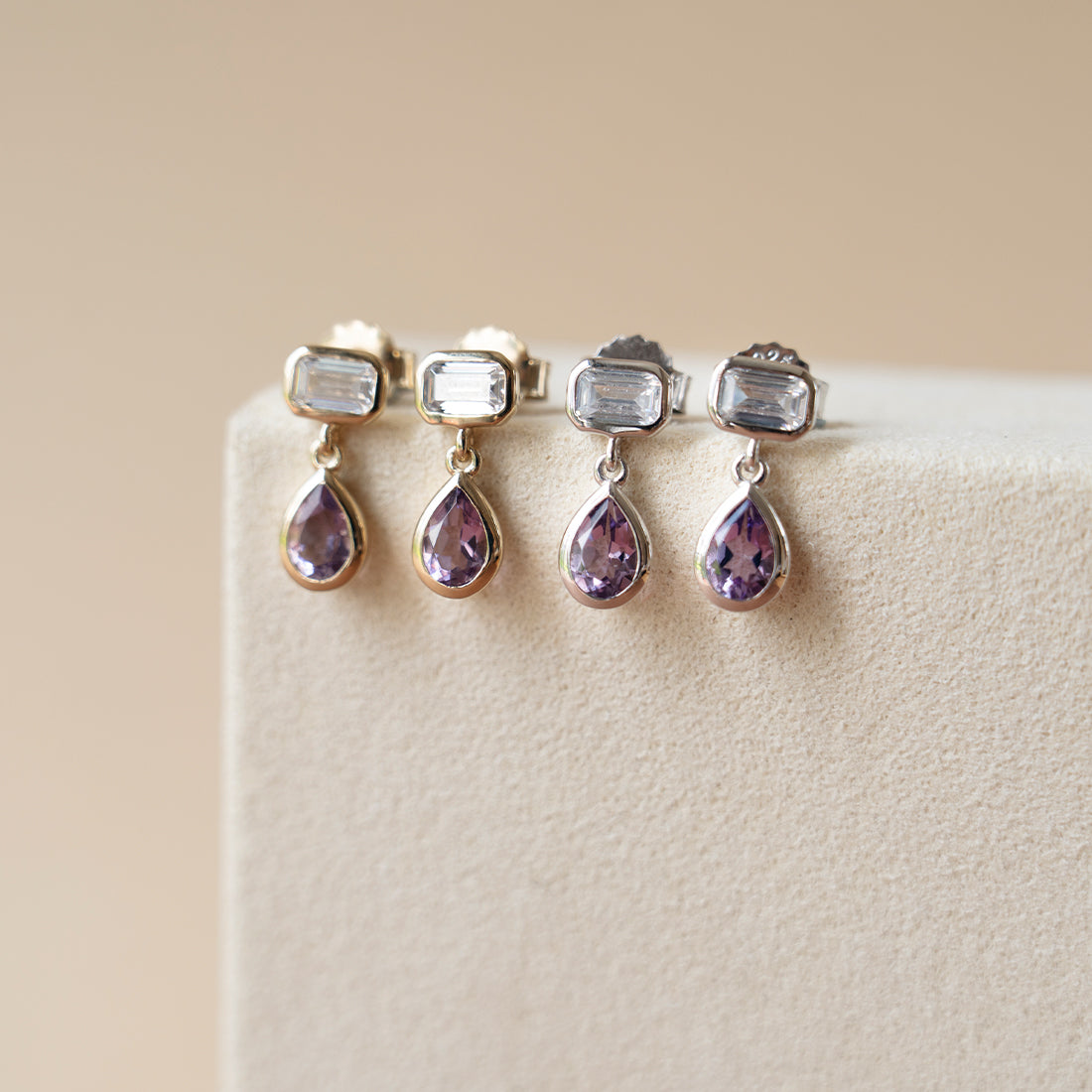 Light-catching and definitely eye-catching! These drop earrings feature an emerald cut cubic zirconia and teardrop shaped amethyst drop. Crafted in 925 Sterling Silver with gold plating or rhodium plating, hence no worries of tarnish. Wear this charming pair with its matching necklace and a floral dress for brunch with the girls.