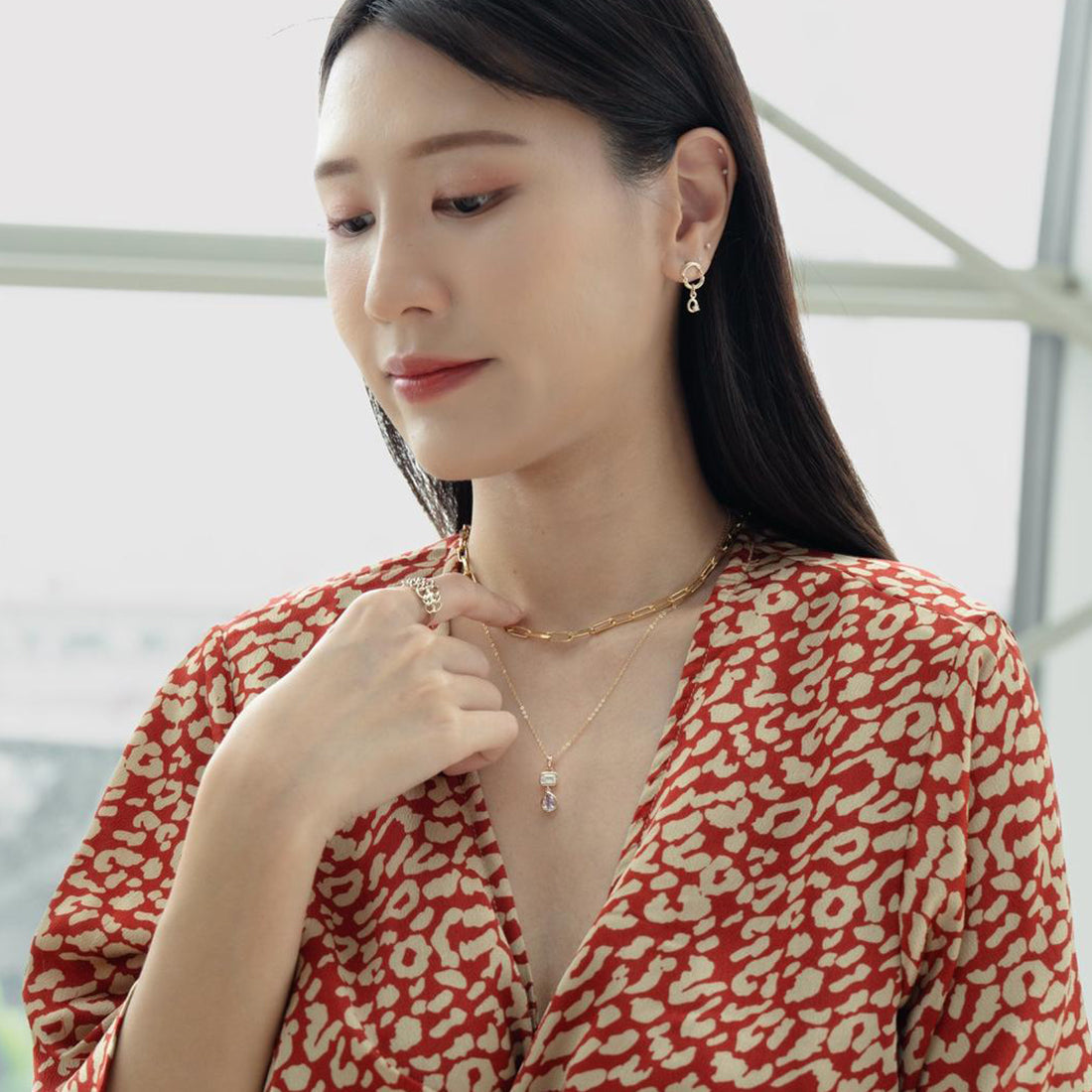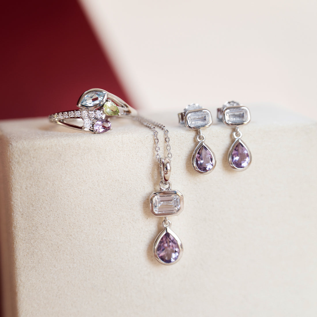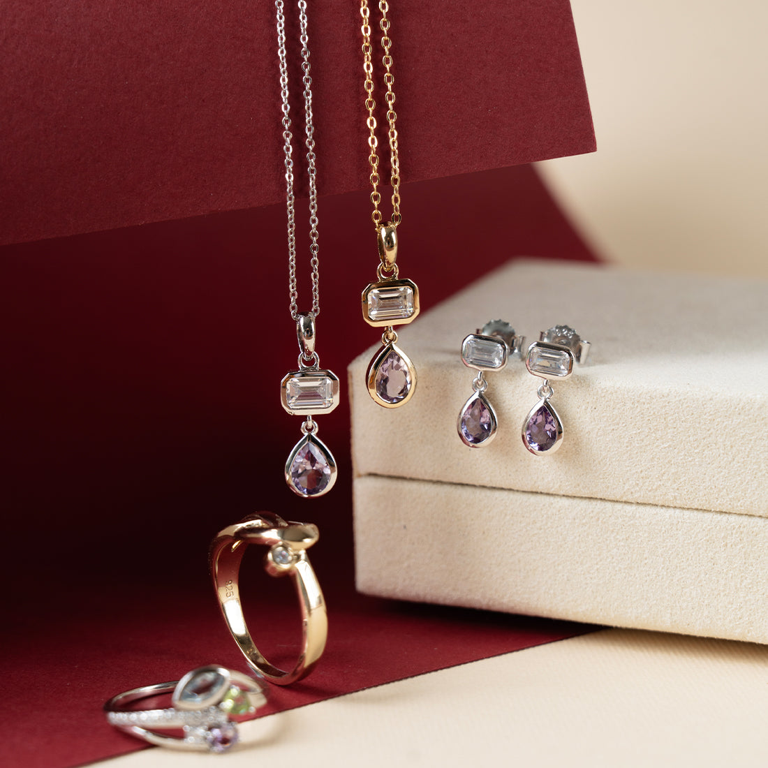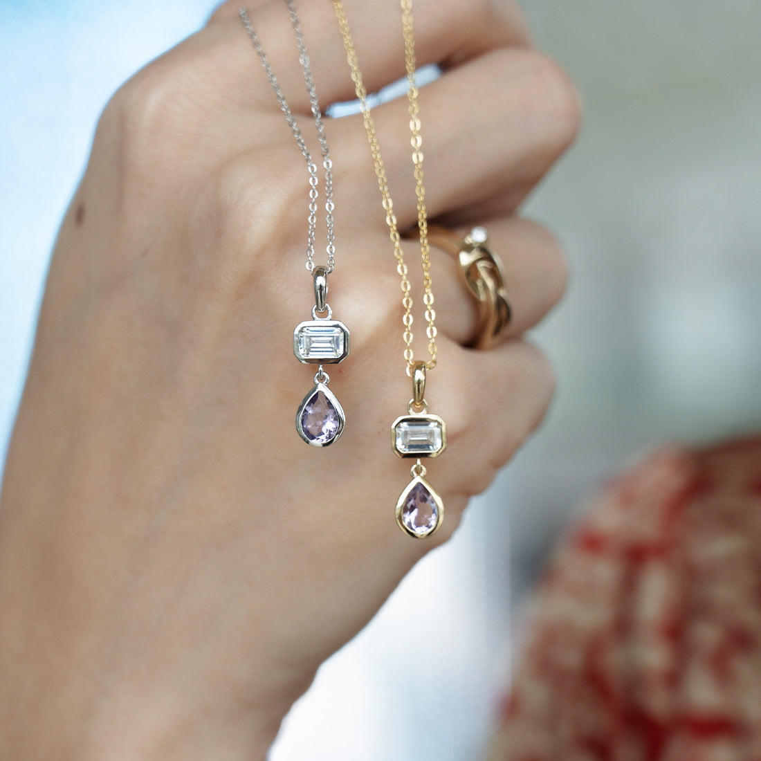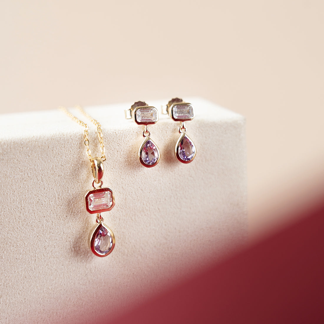 Simple yet luminous. This necklace features a emerald cut cubic zirconia and a teardrop shaped amethyst, set on a dainty chain. Crafted in quality 925 Sterling Silver with gold plating or rhodium plating, hence no worries of tarnish. This feminine piece is perfect for adding a touch of colour your outfit. Style alongside its matching earrings and shift dress for the office.