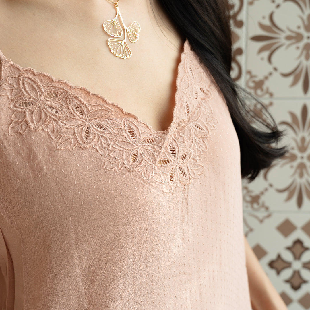 A sweet addition to your wardrobe. This dobby fabric cami top has thin shoestring straps sweetheart neckline with floral eyelet detailing. Comes in a blush pink and pastel blue. A staple piece that is easily styled with denim or a maxi skirt.