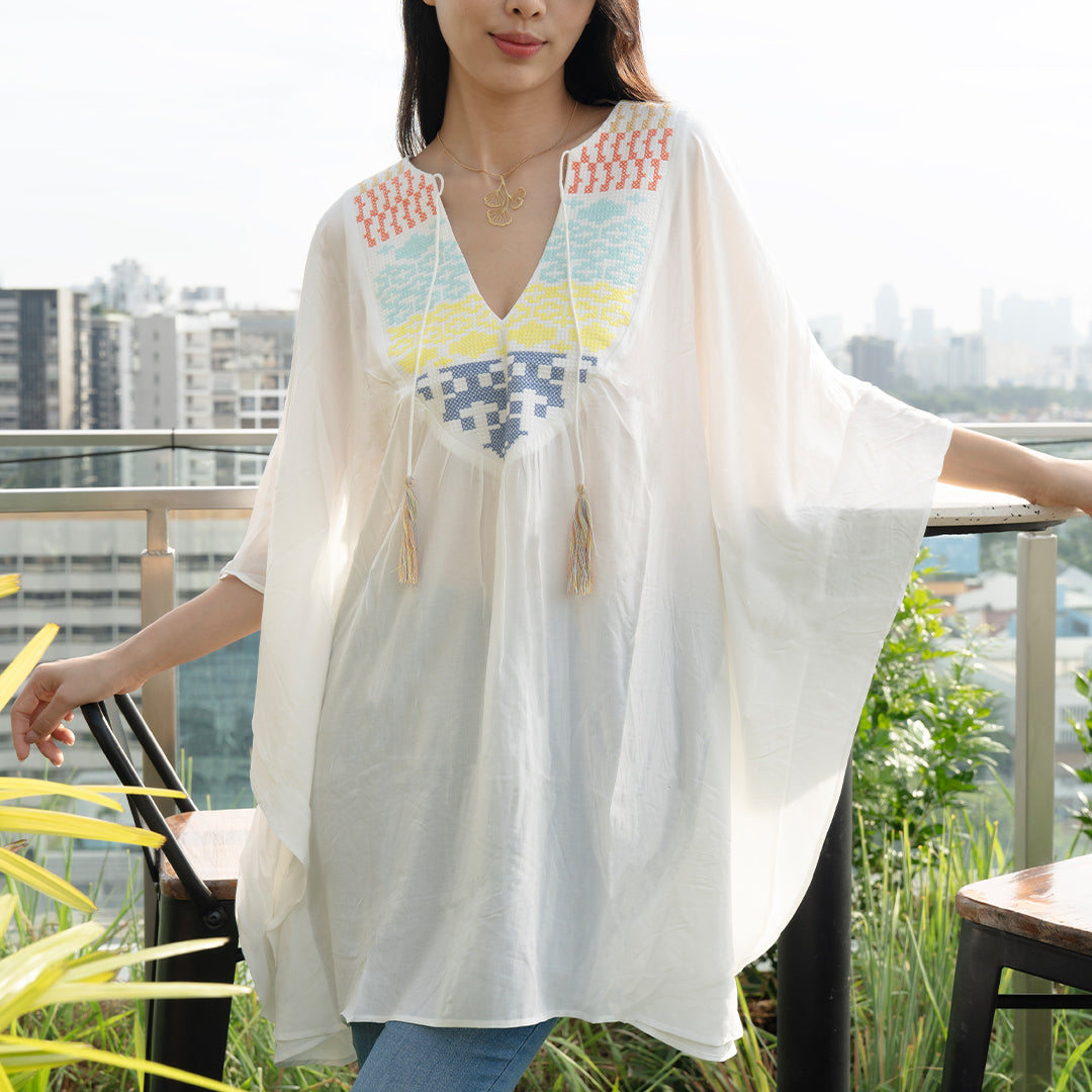 Bring this on your next resort getaway! This kaftan dress is sheer, white and has cross-stitch embroidery on the neckline. It features bat-wing sleeves, a v-neckline with tassel ties. Great for throwing over your swimsuit or worn as an mini dress with slip underneath.