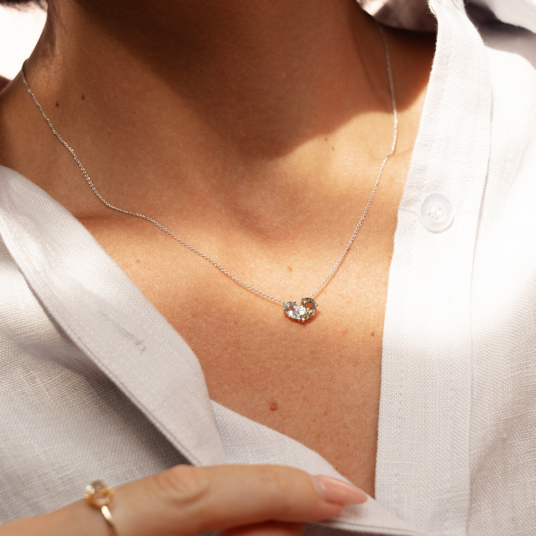 Meet your new everyday favourite! The Merge Necklace features a dainty heart pendant crafted from a pear cut aquamarine and a larger pear cut green amethyst paired together to form a sweet, modern heart silhouette. Light, dainty, and super wearable, this necklace brings a soft pop of colour to any outfit, from brunch days to date nights. The piece a subtle two-tone glow that catches the light beautifully. Set on a fine 14k white gold chain, this piece is made to last. It’s the perfect gift for her, everyday necklace, or layering piece for your curated stack.