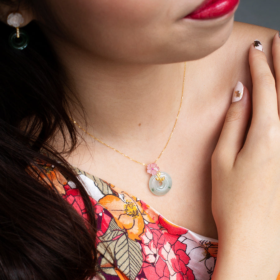 Pretty as a petal. This beauty feature a carved mother of pearl flower with a ruby set in the centre, gold leaves and a luminous jade donut hanging on a fine 18k gold chain.. Secured with a lobster clasp and extension chain. Crafted in 18K solid gold, this necklace is made to last. With its sweet design and colour contrast, these will make a feminine statement. We love it with a floral blouse for a feminine look.