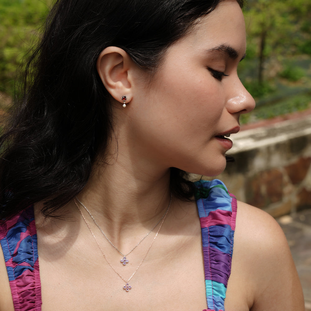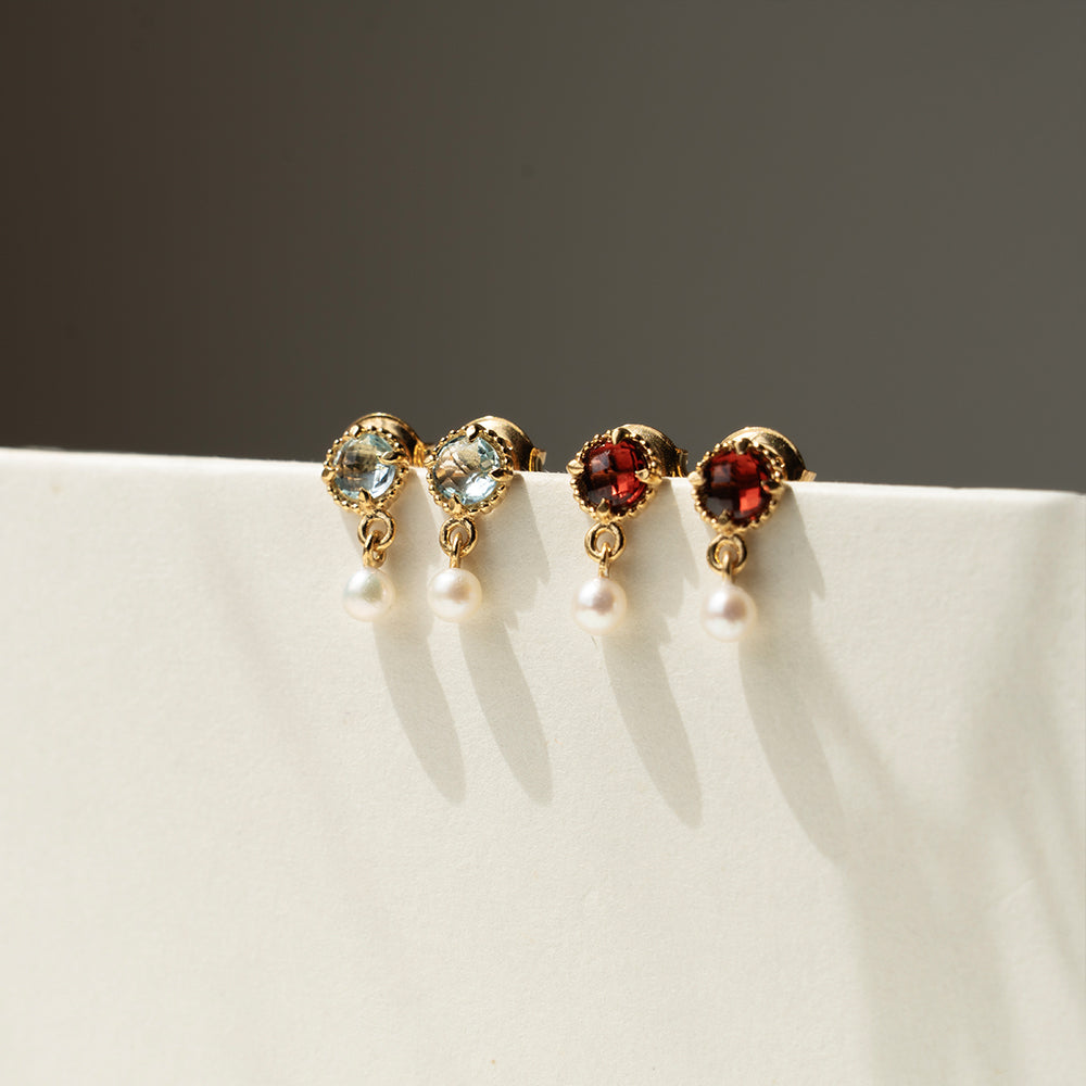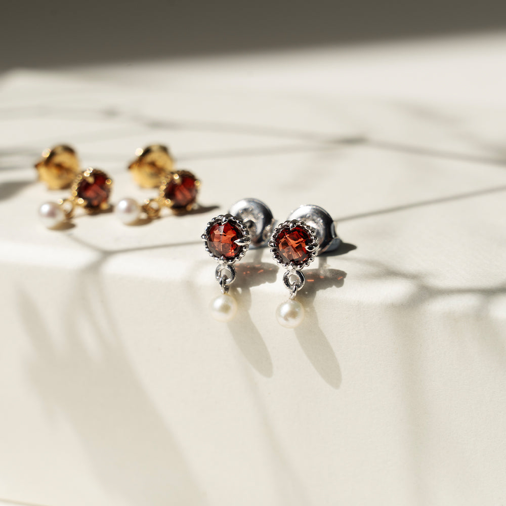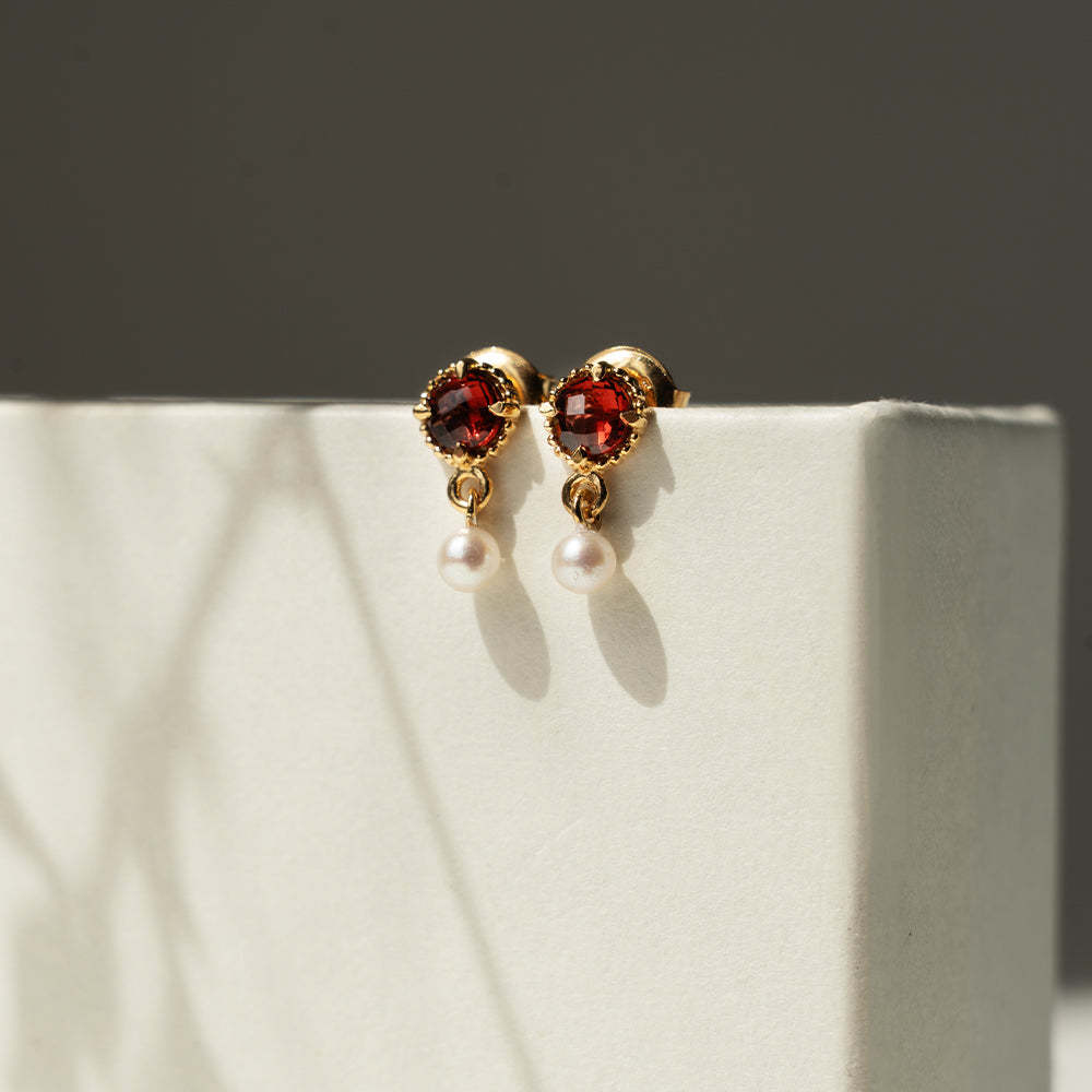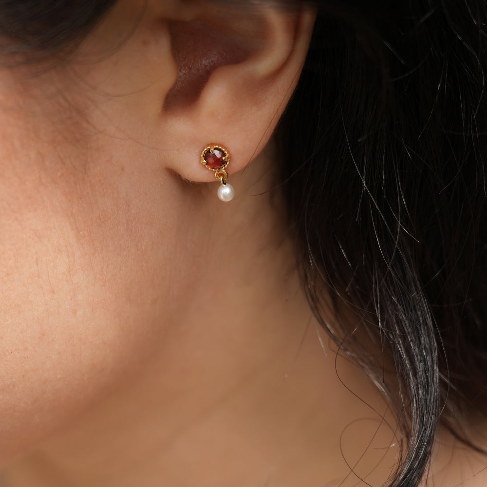 A pretty addition to your ear stack! These small studs has a round garnet with a dotted rim and a tiny pearl drop. Crafted in 925 sterling silver with gold plating or rhodium plating, hence no worries of tarnish. Petite yet distinct, these sweet studs will attract all the right attention. Wear them solo or stack them with other dainty studs for a sweet ear party.