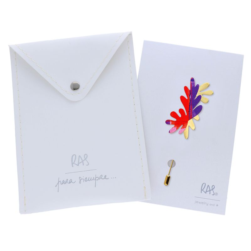 Perfect for dressing up your lapels! The RAS Lucia Brooch features a circle stud with a porcelain print and a pentagon shape with leaf cut out. Crafted in brass with gold plating. Perfect with an all white outfit.