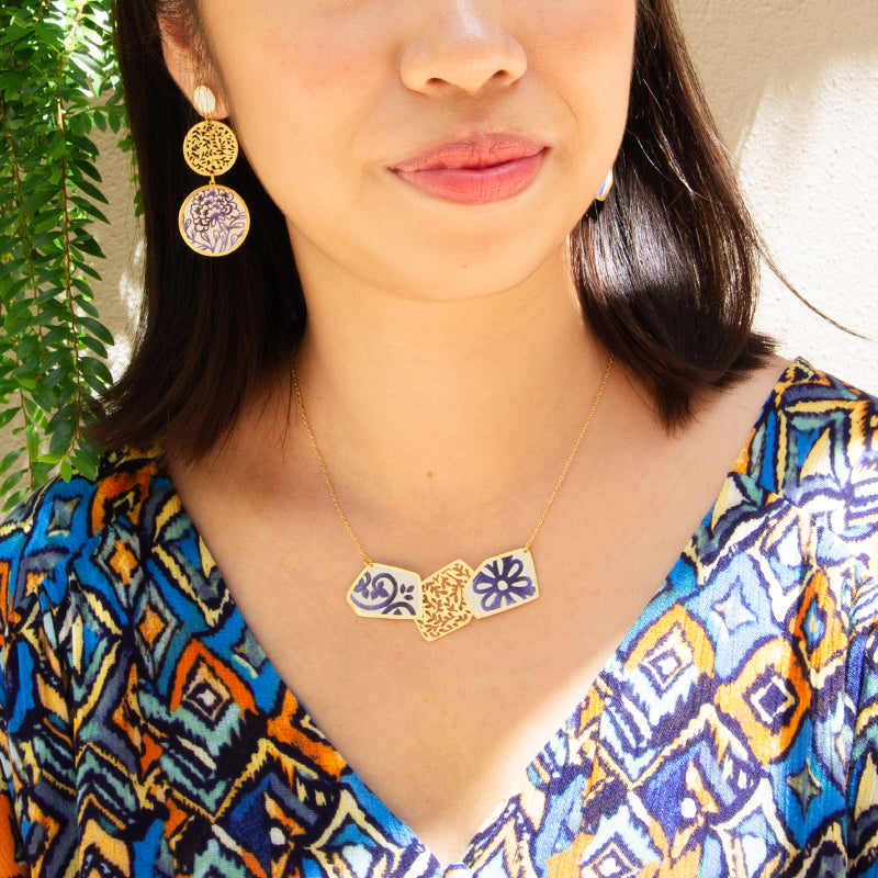 For those with an artistic flair! The RAS Porcelana earrings features a double circle design with a porcelain print and a leaf cut out. Crafted in brass with gold plating. Perfect with an all white outfit.