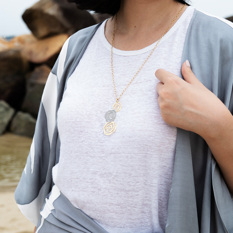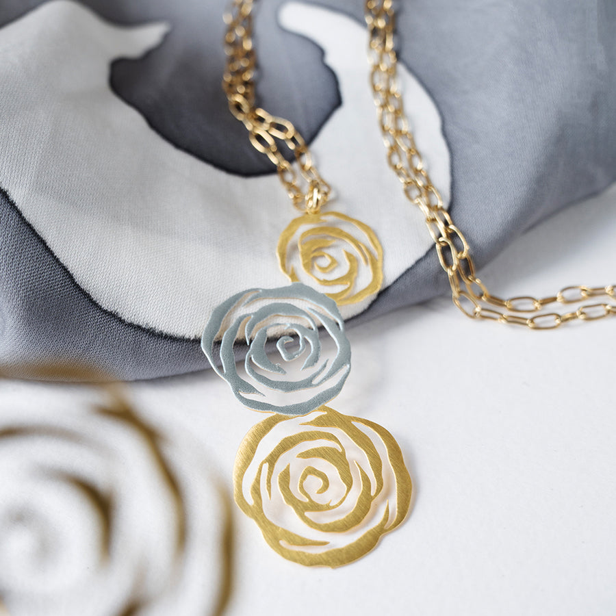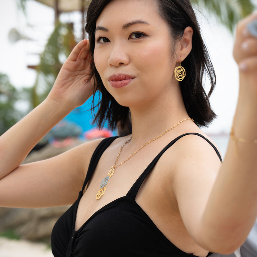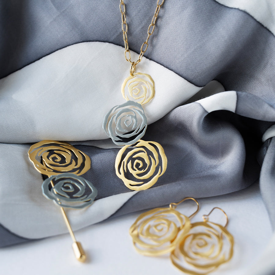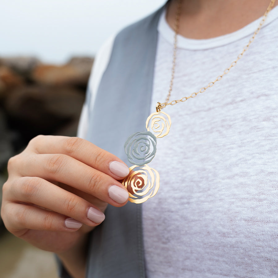 Freshen up your look with the Rose Necklace! This long pendant necklace features a triple rose design in grey and gold, set on a paperclip chain. Its length can be adjusted to suit your look! Pendant can be worn either side — switch between an all gold look or a pop of grey. Crafted in brass with 18k gold plating and a layer of anti-tarnish. We love this elegant statement piece with its matching earrings and an all white outfit.