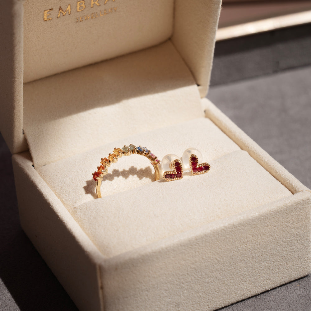 A spectrum of colour, captured in fine detail. These rainbow sapphire rings bring together a curated gradient of hues, each stone carefully set to create a seamless flow from one shade to the next. Crafted in 18k solid gold or white gold, these rings are made to last. The vibrant sapphires are in staggered arrangement silhouette on a slim shank. Each stone catches the light differently, giving the rings a lively, ever-changing sparkle. A joyful yet polished piece that adds colour to your daily rotation.