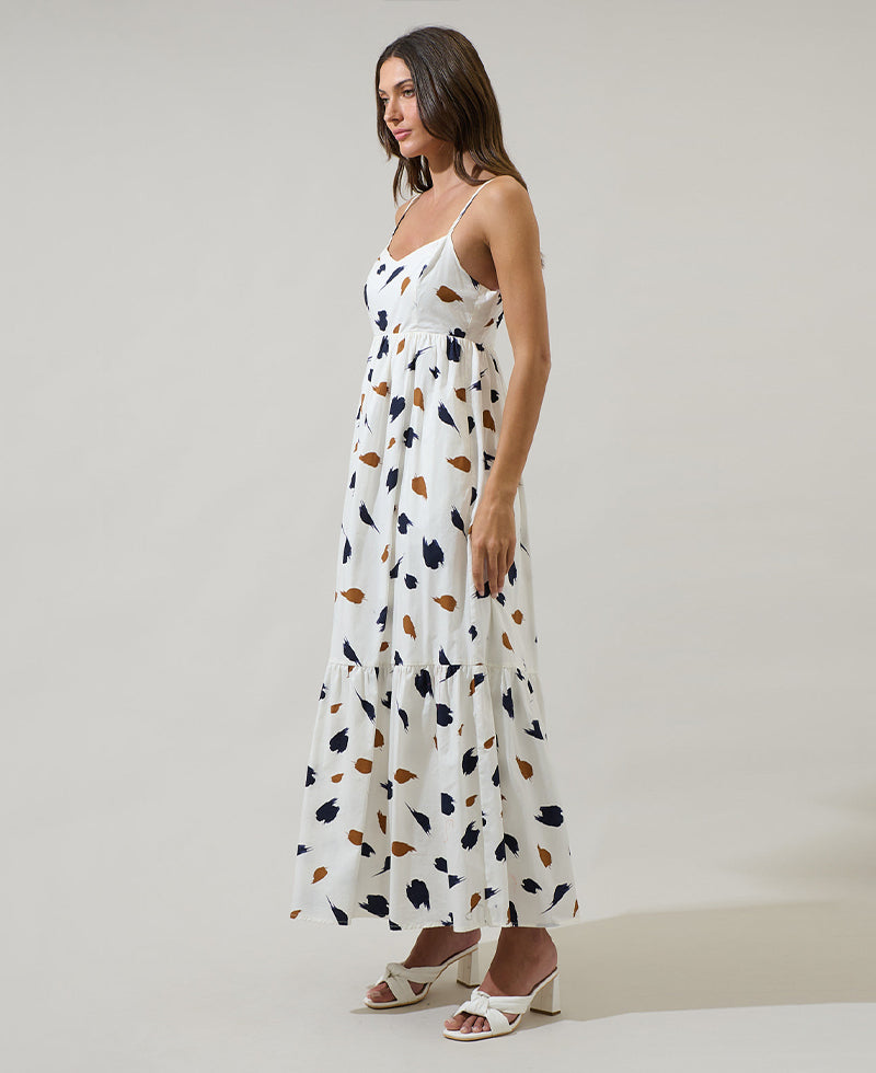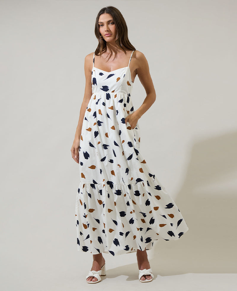 Bring a little fun to your look with the Devania Brush Cabana Flowy Maxi Dress. Navy and brown brush strokes design this empire high waisted dress with adjustable straps. It has a smocked back and pockets on each side. Pair it with brown heels and gold jewelry to match.