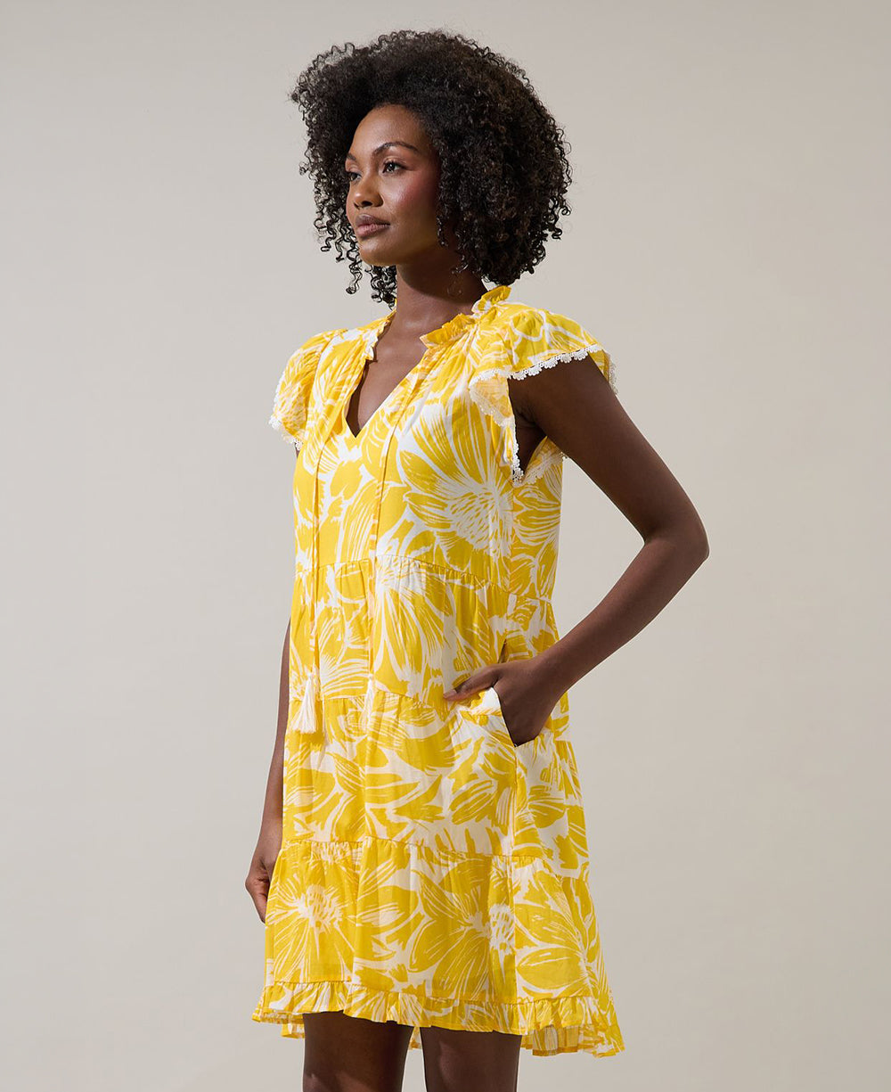 Bring the sunshine wherever you go in this girly floral dream dress. Designed in a flattering shift silhouette, it features short ruffle sleeves, a split neckline with a tassel tie, and a tiered skirt that moves beautifully with every step. Finished with side pockets for everyday ease, this versatile floral dress pairs effortlessly with sandals, sneakers, or heels. Perfect for brunch, holidays, and sunny days out.