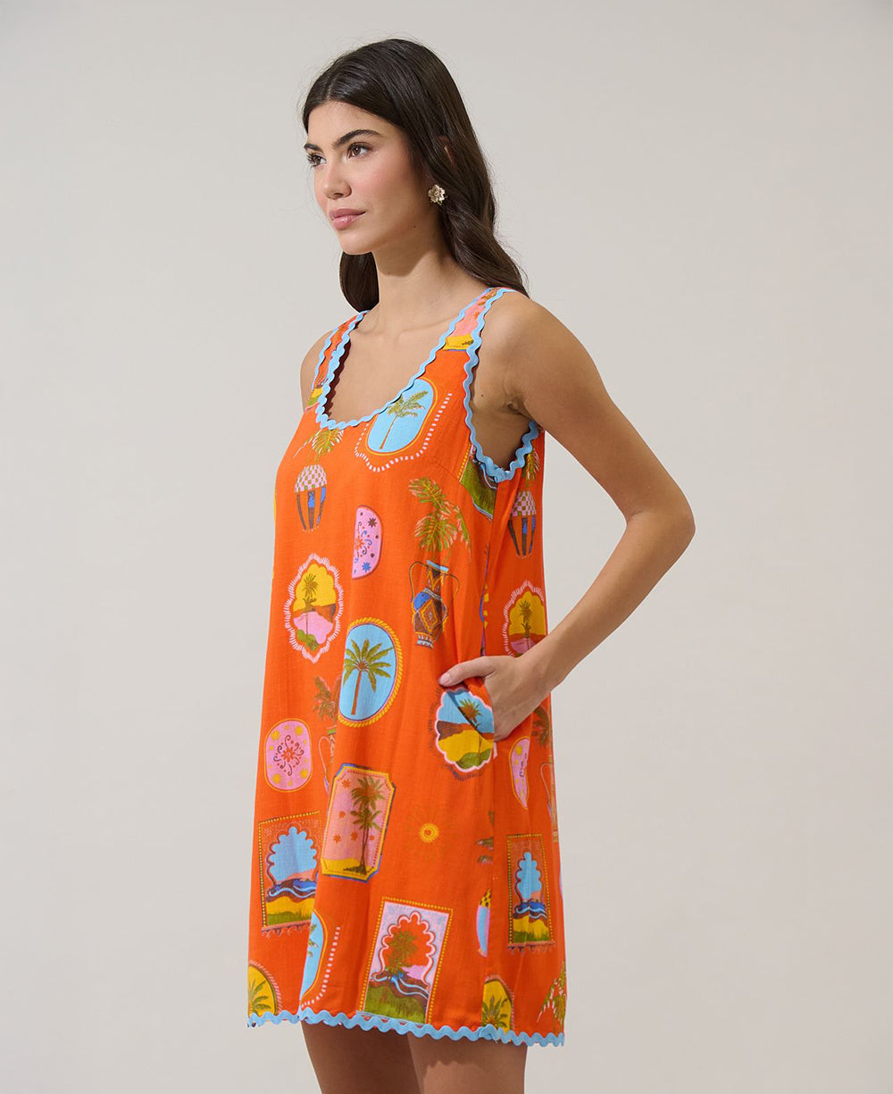 Escape to paradise with this vacation ready piece! The classic A-line silhouette is elevated by contrasting scalloped light blue trim along the neckline and hem. It includes side pockets and offers an airy fit that makes it ideal for warm days.