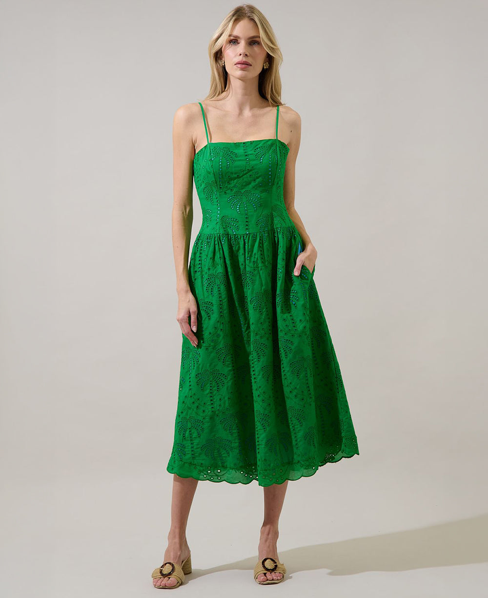 Turn heads in this vibrant green eyelet midi dress, made for sunny days and warm nights. Featuring delicate spaghetti straps, a fitted bodice, and a softly flared skirt, it creates a flattering, feminine silhouette. Intricate eyelet embroidery and a scalloped hem add a romantic touch, while the smocked back ensures a comfortable fit. Complete with pockets for added ease, this sleeveless palm design midi dress pairs effortlessly with heels for weddings, dinners, and special occasions.