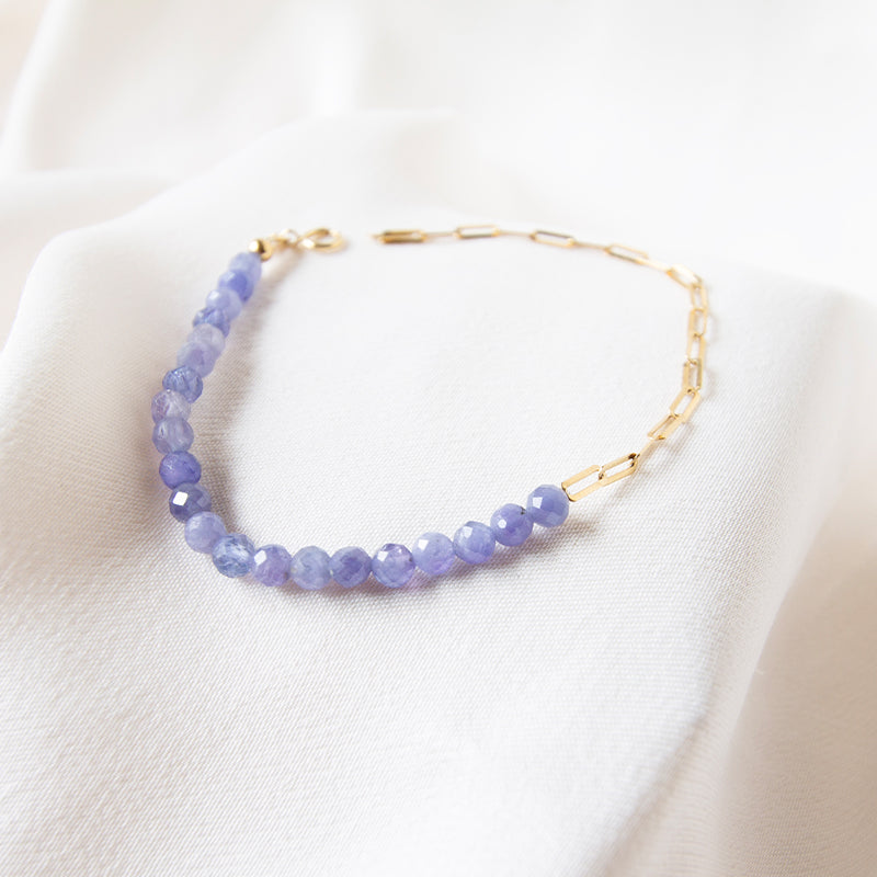 A good addition to any wrist stack! This bracelet is half string of tanzanite beads and half link chain. It is adjustable to fit most wrist sizes. Crafted in 18K gold, this bracelet is made to last. Dainty and easy-to-wear, this beauty will play well with other as well as sitting solo. We love it with other gold chain or stacked with your watch.