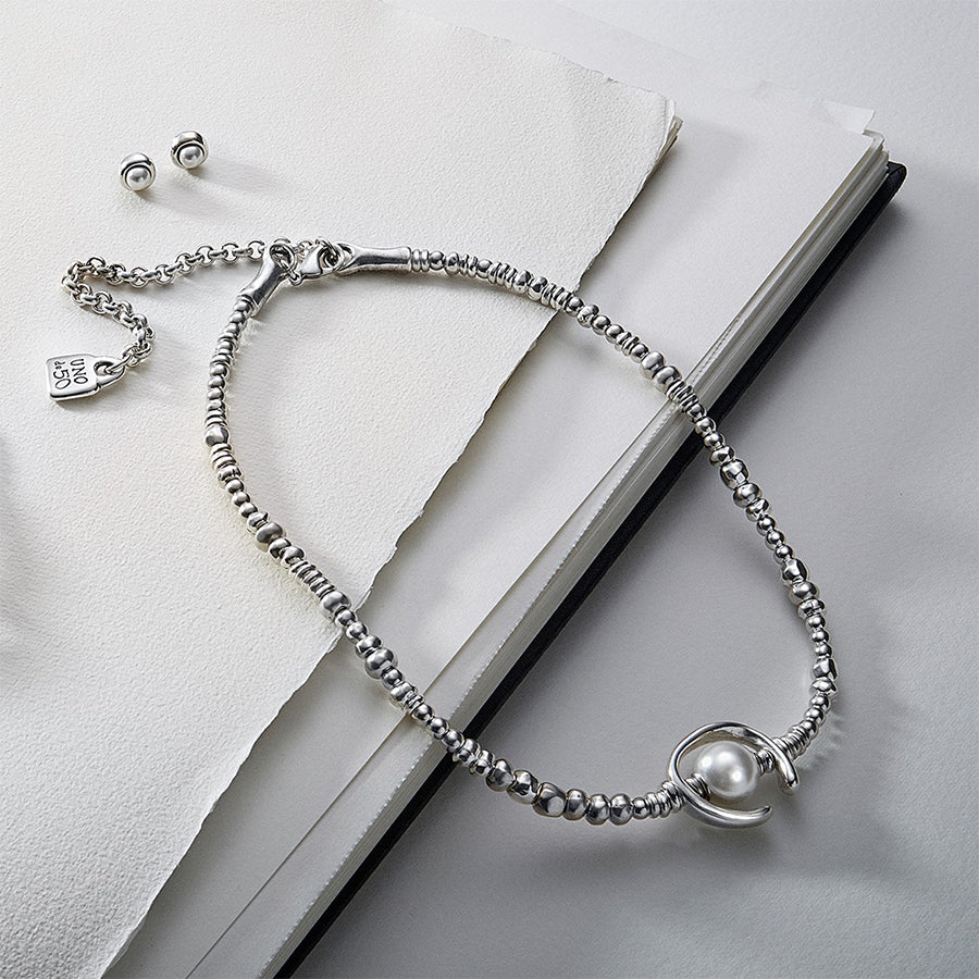 The Another Round Oh Oh Oh! Necklace from UNOde50 is a short necklace with silver-plated beads, a crescent design with a pearl set in the center.