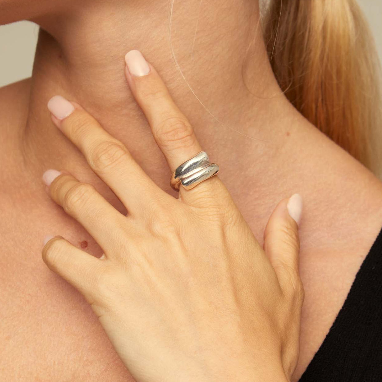 Always bold, never regular! The Crossed Legs Ring from UNOde50 is silver plated and has a wrap around design with squared ends. Stack it with other chunky rings for a statement look.