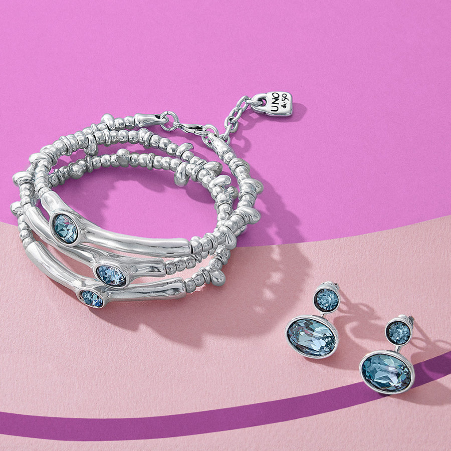Get armed and ready with this stunning arm candy! The Delirium bracelet from UNOde50 is silver plated and has a 3 layer design with blue Swarovski crystals. Polished and sculptural, will add a little glamour to your office shirt and pencil skirt ensemble.