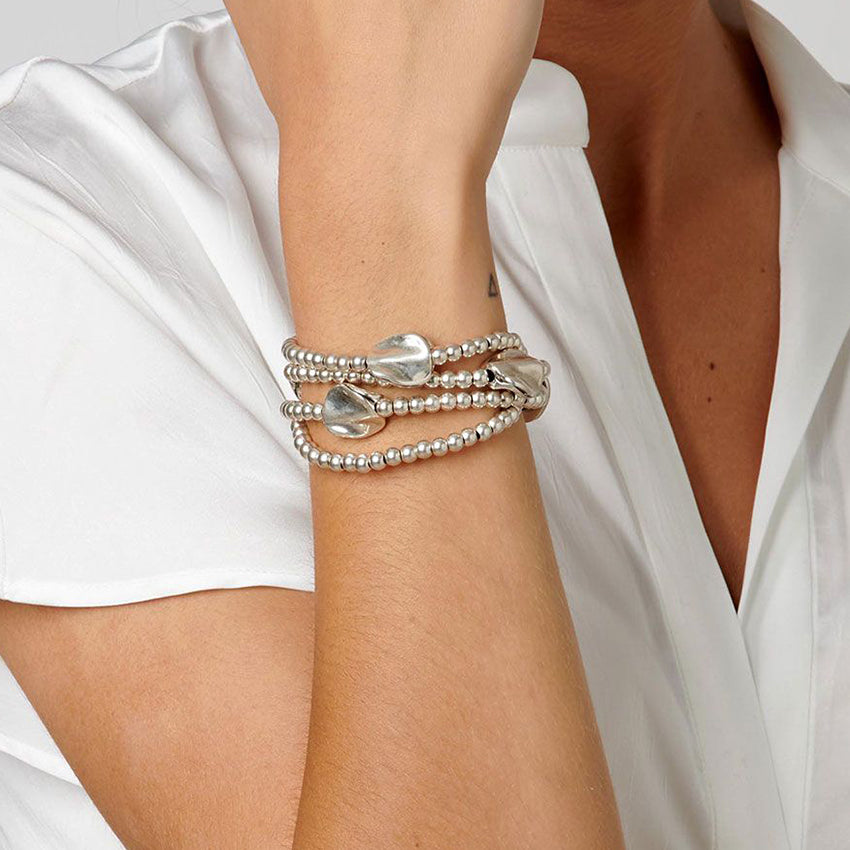 A bold piece to add some shine to your look! The Divina Mente bracelet from UNOde50 features silver plated beads with bigger pebble-like charms, secured with a loop and toggle closure. Rock it with your sleek jumpsuits.