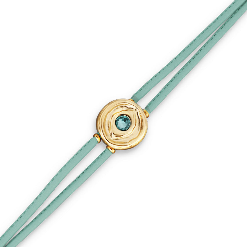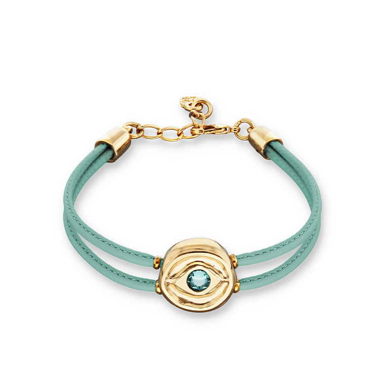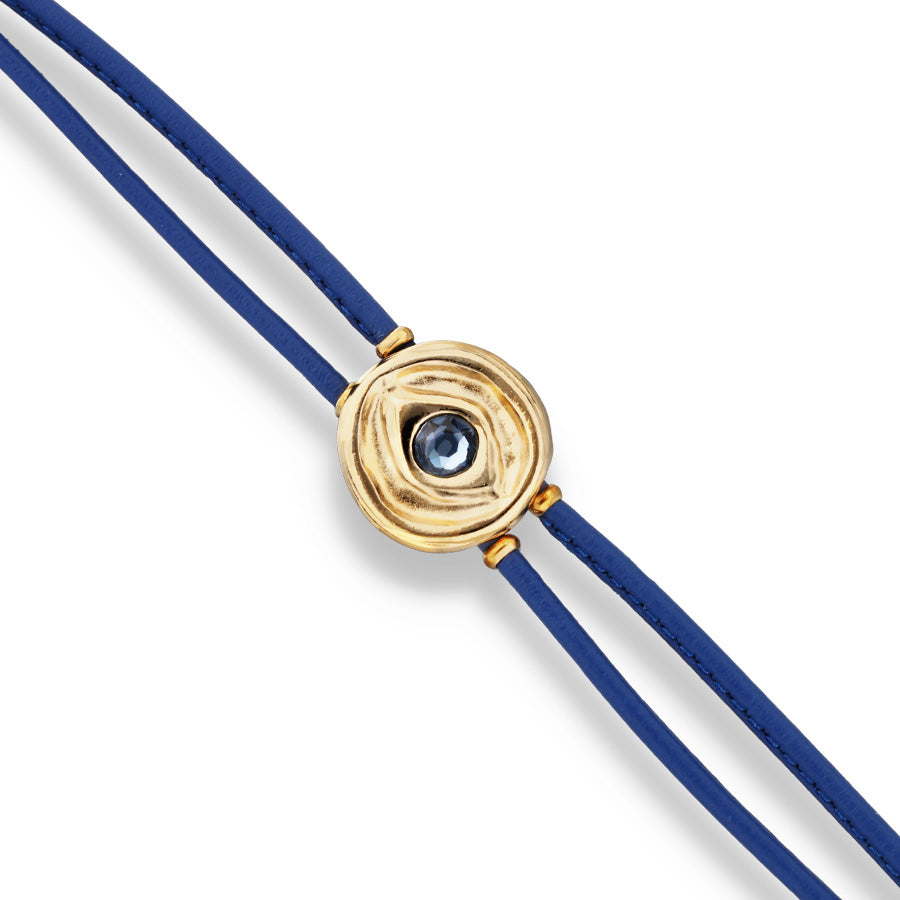 An eye-catching piece to add to your stack! This UNOde50 bracelet features a double leather strap with a gold plated coin charm with an eye motif with a swarovski crystal in the center. A fun piece that can be worn solo or stacked with other bracelets.