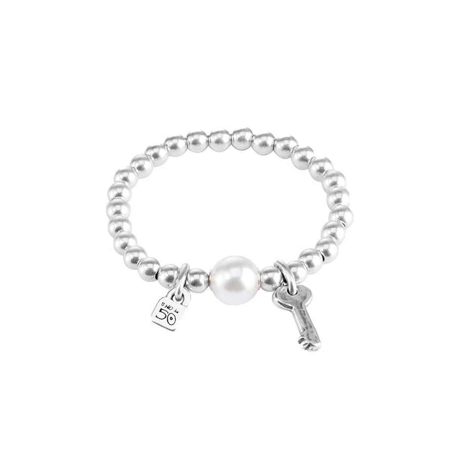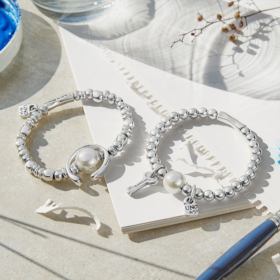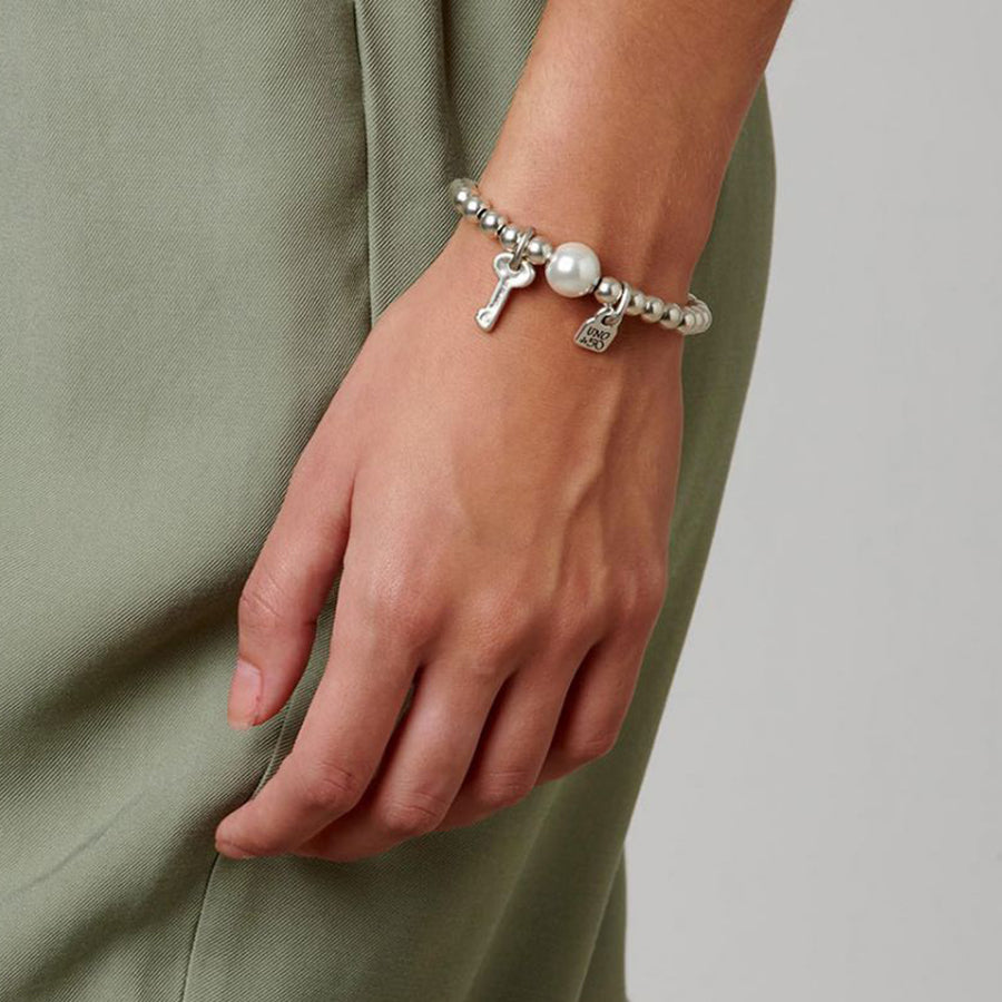 This bracelet has the key to our hearts! The UNOde50 Llavestruz Bracelet is elasticated and features a silver-plated beaded chain with a key and lock charms and a luminous pearl. This sweet charm bracelet will make an amazing gift!