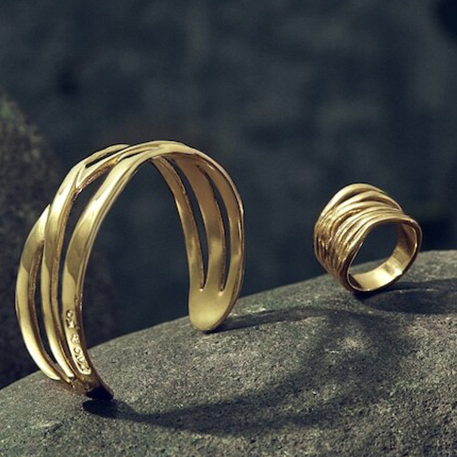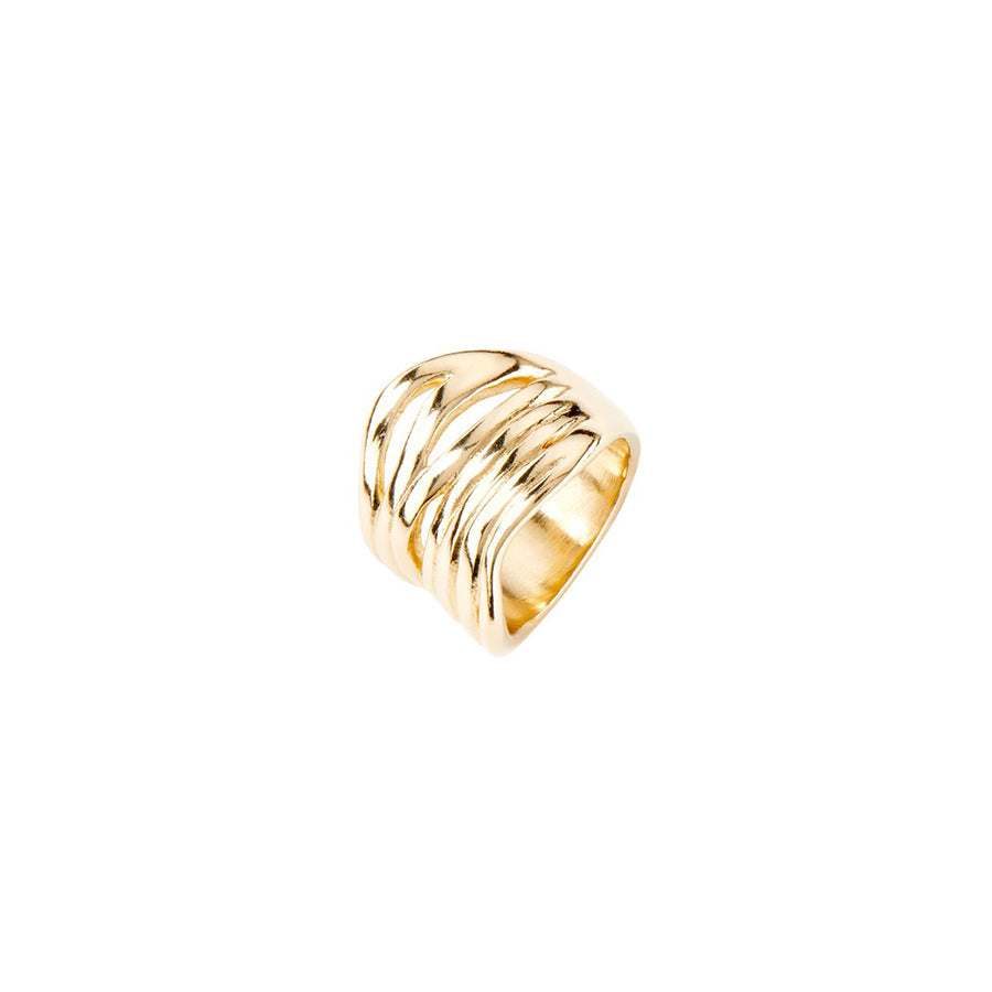 Geometrical and minimal, this ring will go with any look. The Nihiwatu Beach Ring from UNOde50 is chunky with a ridged design. With its undulating profile and gold plating, this iconic piece will be your go to piece.
