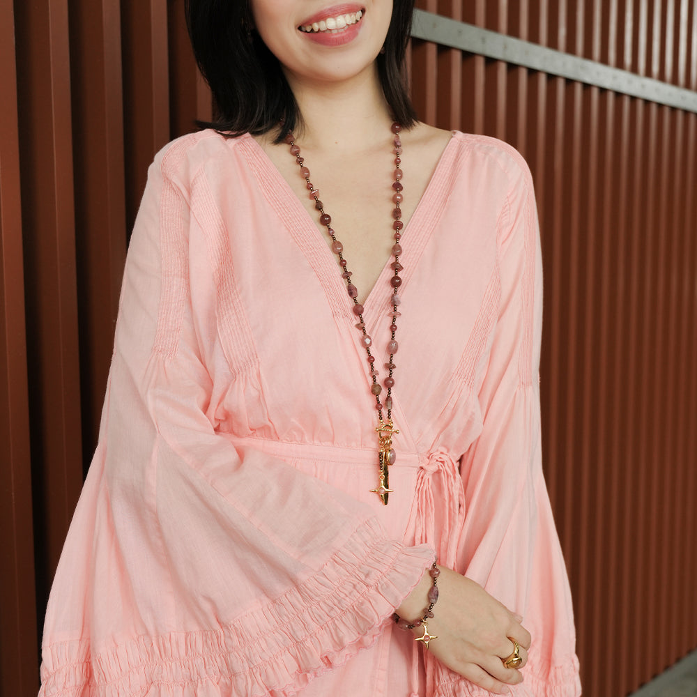 Make some room in your jewellery box for this!This long necklace from Velatti features a red toned gemstones with a hanging 24k gold plated charm cluster. Secured with toggle and loop closure in the front and can be worn long or doubled up for a a layered look. Style this pretty on its own with a printed dress.