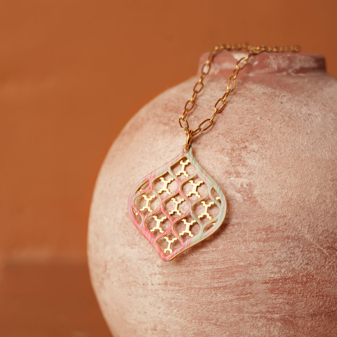 Bring soft colour and modern texture into your everyday style with this Woven Leaves Necklace. Designed to match our Woven Leaves Earrings, it features a double layered lattice leaf pendant, a vibrant pink-and-teal ikat printed front and a polished gold lattice back piece that peeks through with every movement. The layers can be switched to have the gold piece in front, or worn back to front for an all-gold moment. Crafted in brass with 18k gold plating and a layer of anti-tarnish. The pendant hangs from a sleek long paperclip link chain, giving the piece a clean, elongated silhouette that’s perfect for layering or wearing solo. Lightweight, eye-catching, and easy to style, it adds just the right amount of shine and pattern to both casual and dressy looks. We love it with its matching earrings and floral dress for a chic resort look.